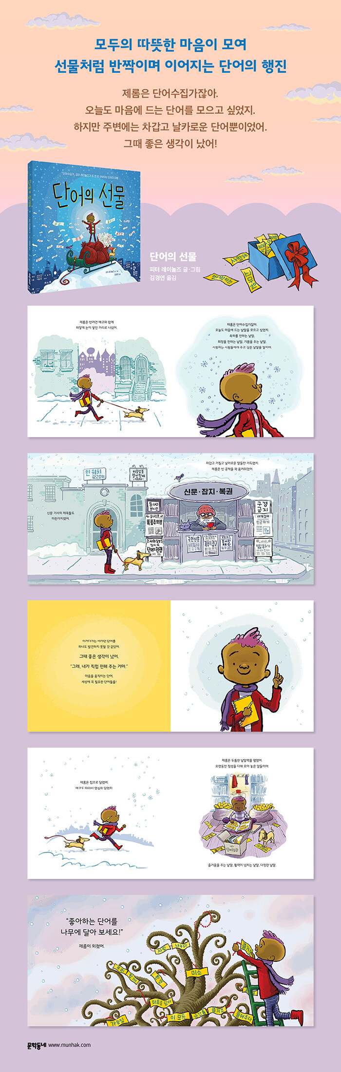 ¡º´Ü¾î¼öÁý°¡¡»¿¡¼ ¸¶¹ý °°Àº ´Ü¾îÀÇ ÈûÀ¸·Î ¸¹Àº À̵鿡°Ô °¨µ¿À» ÁÖ¾ú´ø ÇÇÅÍ ·¹À̳îÁî°¡ ÁÖÀΰø Á¦·Ò°ú ÇÔ²² ½ÅÀÛ ¡º´Ü¾îÀÇ ¼±¹°¡»·Î µ¹¾Æ¿Ô´Ù. ÇϾé°Ô ´«ÀÌ ½×ÀÎ °Ü¿ï³¯ Á¦·ÒÀº Æò¼Òó·³ ¸¶À½¿¡ µå´Â ´Ü¾î¸¦ ã±â À§ÇØ ¹Ý·Á°ß ¿¡ÄÚ¿Í °æÄèÇÑ °ÉÀ½À¸·Î ±æÀ» ³ª¼±´Ù. Á¦·ÒÀÌ Ã£´Â °Ç ÃàÇÏ¿Í Èñ¸ÁÀ» ÀüÇÏ´Â, ±â»ÝÀÌ ´ã±ä, »ç¶ûÇÏ´Â »ç¶÷µé¿¡°Ô ÁÖ°íÇ ³¹¸»µéÀÌ´Ù. ±×·¯³ª °Å¸®¿¡¼ ¸¶ÁÖÄ¡´Â ´Ü¾îµéÀº ¡®Æó¾÷Á¤¸®¡¯ ¡®ÃâÀÔ±ÝÁö¡¯ ¡®°ßÀÎÁ¶Ä¡¡¯¿Í °°Àº Â÷°©°í ³¯Ä«·Î¿î ´Ü¾î»ÓÀÌ´Ù.