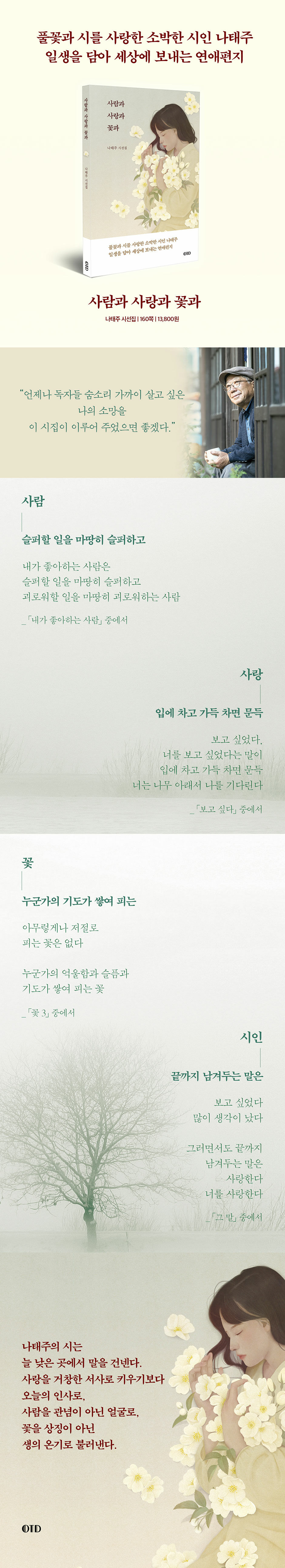 ¡º»ç¶÷°ú »ç¶û°ú ²É°ú¡»´Â Ç®²É°ú ½Ã¸¦ »ç¶ûÇÑ ¼Ò¹ÚÇÑ ½ÃÀÎ ³ªÅÂÁÖ°¡ ÀÏ»ý¿¡ °ÉÃÄ ½á ³»·Á¿Â ¾ð¾î¸¦ ÇÑ ±Ç¿¡ ´ã¾Æ, ¼¼»ó¿¡ º¸³»´Â ÇϳªÀÇ ¿¬¾ÖÆíÁöó·³ °Ç³×´Â ½ÃÁýÀÌ´Ù. ÀÌ Ã¥Àº »îÀÇ Å©°í È·ÁÇÑ Àå¸éº¸´Ù ½ºÃÄ Áö³ª°¡±â ½¬¿î ¼ø°£µé, ¸» °ÉÁö ¾ÊÀ¸¸é »ç¶óÁú °Í °°Àº °¨Á¤µéÀ» ¿À·¡ ºÙÀâ¾Æ¿Â ½ÃÀÎÀÇ Åµµ¸¦ Á߽ɿ¡ µÐ´Ù. ³ªÅÂÁÖÀÇ ½Ã´Â ¾ðÁ¦³ª ÀÛ°í ³·Àº °Íµé¿¡¼ Ãâ¹ßÇØ, Àд ÀÌÀÇ ¸¶À½ ÇѰ¡¿îµ¥·Î °ð°Ô ´ê´Â´Ù.