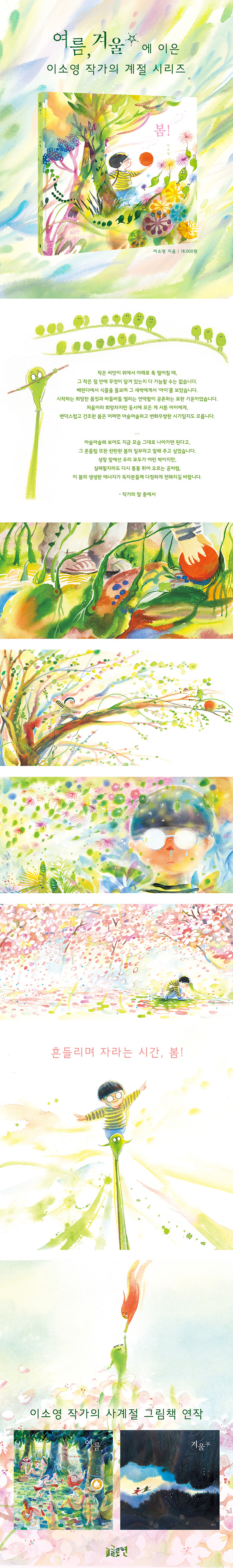 ¡ºº½!¡»Àº ¡º¿©¸§,¡»°ú ¡º°Ü¿ï*¡»¿¡ À̾îÁö´Â »ç°èÀý ±×¸²Ã¥ ¿¬ÀÛ °¡¿îµ¥ ÇÑ ±ÇÀÔ´Ï´Ù. ¡º¿©¸§,¡»¿¡¼´Â ºÓÀº ¿©¸§À̰¡, ¡º°Ü¿ï*¡»¿¡¼´Â ûȸ»ö °Ü¿ïÀ̰¡ À̾߱⸦ À̲ø¾î °¬´Ù¸é, ¡ºº½!¡»¿¡¼´Â ¿¬µÎ»ö ij¸¯ÅÍ 'º½ÀÌ'°¡ µîÀåÇÕ´Ï´Ù. º½ÀÌ´Â º½ÀÇ »ý¸í·Â°ú ½ÃÀÛÀÇ ¿¡³ÊÁö¸¦ »ó¡ÇÏ´Â Á¸Àç·Î, ¾ÆÀÌÀÇ °ç¿¡¼ Àå¸é¸¶´Ù ¸ð½ÀÀ» µå·¯³»¸ç ¾ÆÀÌ¿Í º½ÀÇ °èÀýÀ» ÇÔ²²ÇÕ´Ï´Ù. ƯÈ÷ À̹ø Ã¥¿¡¼´Â 'º½ÀÌ'¸¦ À§ÇÑ ÀÎÆ®·Î Àå¸éÀÌ ¸¶·ÃµÇ¾î ÀÖ¾î, °Ü¿ïÀ» Áö³ª¿Â º½À̰¡ ǰ°í ÀÖ´Â ¼³·½°ú ±â´ë, ±×¸®°í ±× À̸éÀÇ ÀÛÀº °ÆÁ¤°ú Èçµé¸²À» ÇÔ²² º¸¿© ÁÝ´Ï´Ù. ÀÌ·¯ÇÑ ¸ð½ÀÀº »õ·Î¿î ½Ã°£À» ¸ÂÀÌÇÏ´Â ¾ÆÀÌÀÇ ¸¶À½°ú ÀÚ¿¬½º·´°Ô ¸Â´êÀ¸¸ç, ÀÌÁ¦ ¸· ½ÃÀ۵Ǵ ¼ºÀåÀÇ ½Ã°£À» ÀºÀ¯ÀûÀ¸·Î ºñÃß°í ÀÖ½À´Ï´Ù.