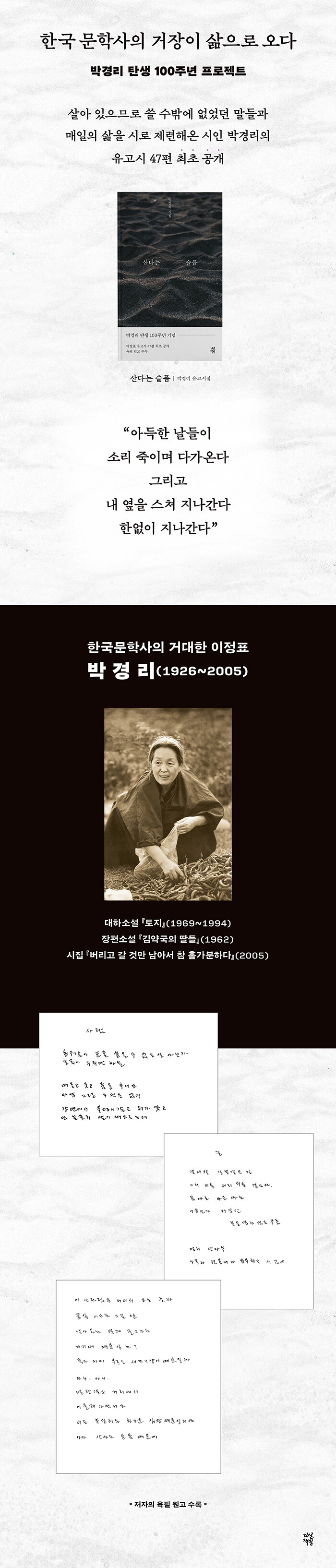 1990³â´ë, ´ëÇϼҼ³ ¡ºÅäÁö¡»ÀÇ ÃÖÁ¾ÀåÀÎ 5ºÎ¸¦ ÁýÇÊÇÏ´ø ½Ã±â´Ù. ¿øÁÖ·Î »îÀÇ ÅÍÀüÀ» ¿Å±ä ¹Ú°æ¸®´Â ³ëÆ®¿Í ¿ø°íÁö À§¿¡ ÇÏ·çÇÏ·çÀÇ »îÀ» Àû¾î ³»·Á°¬´Ù. ÀÌ ½Ã±â¿¡ ¾²ÀÎ ½ÃµéÀº ¹®´ÜÀÇ Æò°¡³ª µ¶ÀÚÀÇ ½Ã¼±À» ÀǽÄÇÏÁö ¾ÊÀº, Áö±ØÈ÷ »çÀûÀÌ°í ³»¹ÐÇÑ ±â·Ï¿¡ °¡±õ´Ù. ³Ê¹« ¼ÖÁ÷ÇÏ°í ³Ê¹« °³ÀÎÀûÀ̶ó´Â ÀÌÀ¯·Î ¸¹Àº ÀÛǰÀº »ýÀü¿¡´Â ¼¼»ó¿¡ ³»º¸ÀÌÁö ¸øÇß´Ù. ±×Áß 47ÆíÀÇ ½ÃµéÀ» ź»ý 100ÁÖ³âÀ» ±â³äÇØ ¼¼»ó¿¡ ³»³õ´Â´Ù.