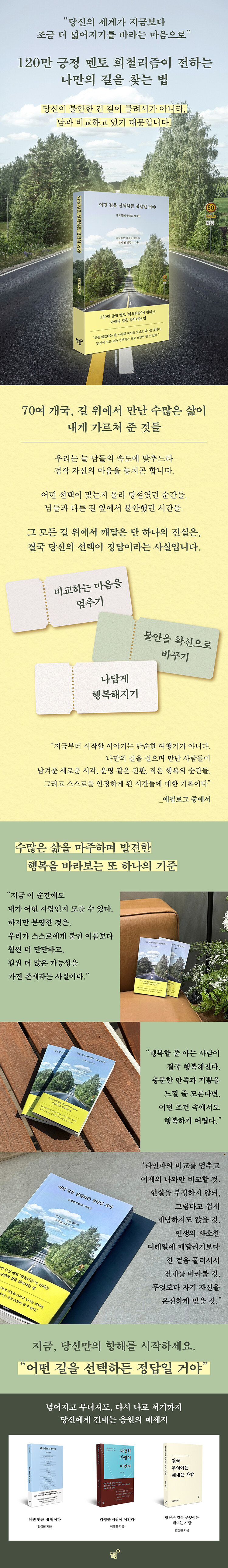 ÀÌ Ã¥Àº ¼º°øÀ» À§ÇÑ ±â¼úÀ» ¸»ÇÏÁö ¾Ê´Â´Ù. ´ë½Å ºñ±³¿Í ºÒ¾È ¼Ó¿¡¼ Èçµé¸®´Â ¸¶À½À» ³»·Á³õ°í, ÀÚ½ÅÀÇ ¼±ÅÃÀ» ¹Ï´Â ¹ýÀ» À̾߱âÇÑ´Ù. ³²µé°ú ´Ù¸¥ ¹æÇâÀ¸·Î °È´Â ¼ø°£¿¡µµ ±¦Âú´Ù°í, ½ÇÆÐ´Â ³¡ÀÌ ¾Æ´Ï¶ó ¶Ç ´Ù¸¥ ¹®ÀÌ ¿¸®´Â °úÁ¤ÀÏ ¼ö ÀÖÀ½À» º¸¿©ÁØ´Ù. Ȥ½Ã Áö±Ý ±æÀ» ÀÒÀº °Íó·³ ´À³¢°í ÀÖ´Ù¸é, ºÒÈ®½ÇÇÑ »îÀÇ ¿©Á¤ ¾Õ¿¡¼ ÁÖÀúÇϰí ÀÖ´Ù¸é, ÀÌ Ã¥ÀÌ ´ç½Å¿¡°Ô ¡®¶Ç ´Ù¸¥ ¹®¡¯ÀÌ µÇ¾î ÁÙ °ÍÀÌ´Ù. ¾î¶² ±æÀ» ¼±ÅÃÇϵç, ±× ±æÀº °á±¹ ´ç½ÅÀÇ Á¤´äÀÌ µÉ °ÍÀ̶ó°í.