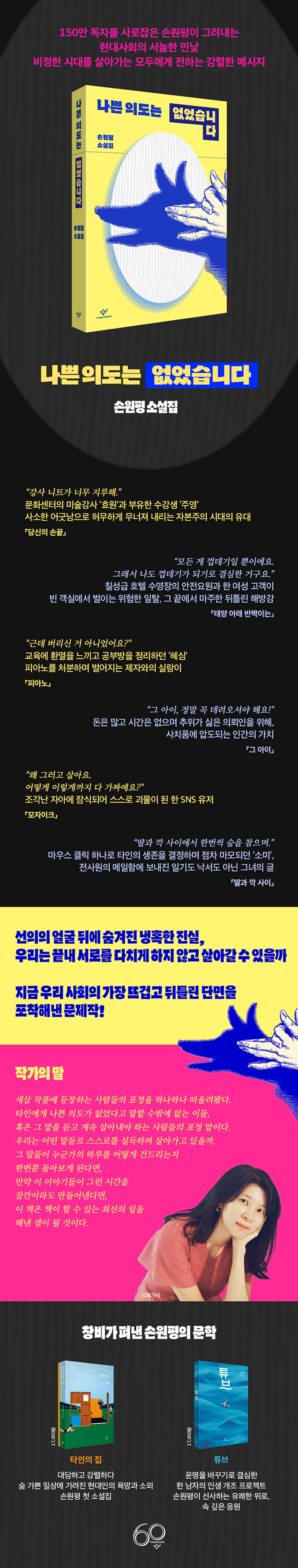 Ç¥Á¦ÀÎ ¡®³ª»Û Àǵµ´Â ¾ø¾ú½À´Ï´Ù¡¯´Â À̹ø ¼Ò¼³Áý Àüü¸¦ °üÅëÇÏ´Â ¼´ÃÇÑ ¹®ÀåÀÌ´Ù. ±×°ÍÀº ¿ÂÀüÇÑ »ç°úµµ ¹Ì¼÷ÇÑ º¯¸íµµ ¾Æ´Ï´Ù. ¿ÀÈ÷·Á ´©±º°¡ÀÇ ³«¿À¿Í »óó¿¡ °¡´ãÇßÀ¸¸é¼µµ ½Ã½ºÅÛÀÇ Å¿À¸·Î ±× Ã¥ÀÓÀ» ±³¹¦È÷ ¶°³Ñ±â´Â ŵµ°¡ ¸¸¿¬ÇØÁø ½Ã´ë¸¦ »ó¡ÇÏ´Â ¸»¿¡ °¡±õ´Ù. ÀÛ°¡´Â ÀÌ ¹®ÀåÀ» Á¤¸é¿¡ ³»¼¼¿ö ¿ì¸®°¡ ÀڽŰú ŸÀÎÀ» ¾î¶² ¸»·Î ¼³µæÇÏ¸ç »ì¾Æ°¡´ÂÁö¸¦, ±× ¸»µéÀÌ ¼·ÎÀÇ ÇÏ·ç¿¡ ¾î¶² ÆÄ¹®À» ÀÏÀ¸Å°´ÂÁö¸¦ Áý¿äÇÏ°Ô ÃßÀûÇÑ´Ù.