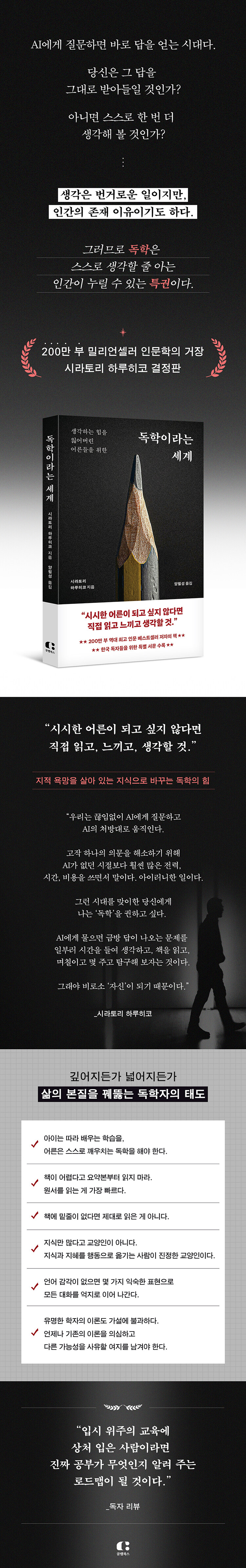 ¡¶µ¶ÇÐÀ̶ó´Â ¼¼°è¡·´Â ±×·± ¾î¸¥µé¿¡°Ô »ý°¢ÇÏ´Â ÈûÀ» µÇã¾Æ ÁÖ´Â ¾È³»¼´Ù. È¥ÀÚ °øºÎÇÏ´Â ÀÏÀÌ ¸·¸·ÇÑ À̵鿡°Ô ¹è¿òÀÇ ¿Á¤À» ´Ù½Ã ±ú¿ì°í, »îÀ» ºû³» ÁÖ´Â µ¶ÇÐÀÚÀÇ Åµµ¸¦ ±¸Ã¼ÀûÀ¸·Î Á¦½ÃÇÑ´Ù. AI ½Ã´ë¿¡ °¡Á®¾ß ÇÒ ¹è¿òÀÇ ÀÚ¼¼ºÎÅÍ ¾î·Á¿î Ã¥À» µ¹ÆÄÇÏ´Â ¹æ¹ý, ¼¼°èÀûÀ¸·Î ÅëÇÏ´Â ±³¾ç¼, ¿Ü±¹¾î¸¦ ÀÍÈ÷´Â °¨°¢, ÀÚ½ÅÀÇ »ý°¢À» ¿Ï¼ºÇÏ´Â ½ÇÀü ±â¼ú±îÁö ÃÑ 5°¡Áö ÇÙ½É ¿ä·ÉÀ» ´ã¾Ò´Ù.