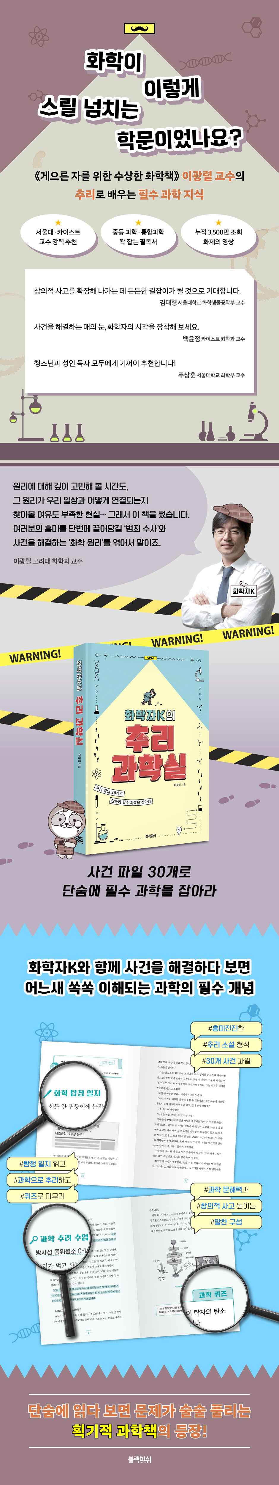 °í·Á´ëÇб³ ÈÇаú À̱¤·Ä ±³¼ö ¿ª½Ã °í±³ ½ÃÀý±îÁö ÈÇÐÀº Á¤¸» Àç¹Ì¾ø´Â °ú¸ñÀ̾ú´Ù°í °í¹éÇÑ´Ù. ÀÌ Ã¥ ¡ºÈÇÐÀÚKÀÇ Ã߸® °úÇнǡ»Àº ¹Ù·Î ±× ÁöÁ¡¿¡¼ Ãâ¹ßÇß´Ù. °úÇÐÀÇ ¼ûÀº Àç¹Ì¸¦ ¹ß°ßÇÒ Æ´µµ ¾ø´Â ¾ÆÀ̵é°ú °úÇÐÀÇ Áñ°Å¿òÀ» ÀØ°í »ç´Â(ȤÀº ¾Æ¿¹ ¸Àº» ÀûÁ¶Â÷ ¾ø´Â) ¾î¸¥µéÀ» À§ÇØ ÀúÀÚ´Â ¸íŽÁ¤ ¡®ÈÇÐÀÚK¡¯·Î º¯½ÅÇß´Ù. Çö½Çº¸´Ù ´õ Çö½Ç °°Àº 30°³ »ç°Ç ÆÄÀÏÀ» âÁ¶Çϰí, »ç°ÇÀÇ °æÀ§¸¦ Ã߸®ÇÏ´Â °úÁ¤¿¡¼ Çʼö °úÇÐ Áö½ÄÀ» ÇØ°áÀÇ ¹«±â·Î Ȱ¿ëÇÑ´Ù.