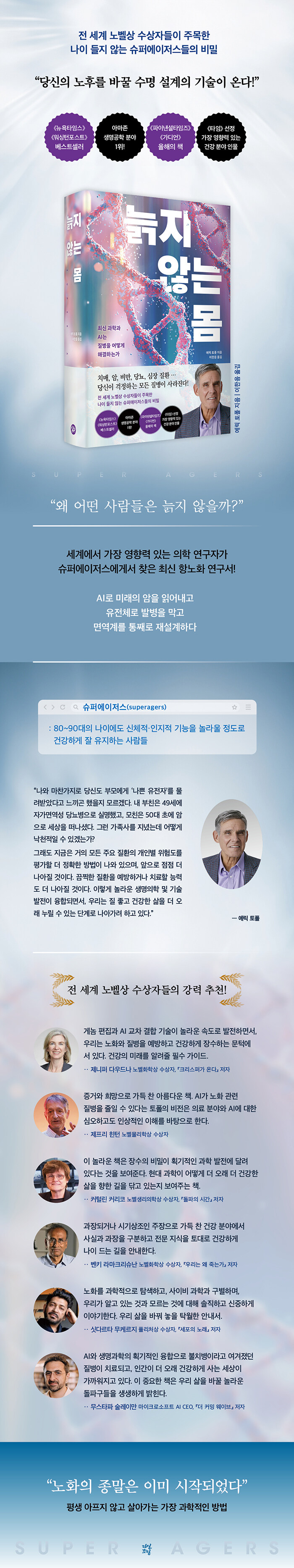 ´©±¸³ª ³ªÀ̸¦ ¸ÔÁö¸¸, ¸ðµÎ°¡ °°Àº ¸ð½ÀÀ¸·Î ³ªÀÌ µéÁö´Â ¾Ê´Â´Ù. ¾î¶² »ç¶÷µéÀº ³ªÀ̰¡ µé¾îµµ ÀÎÁö ´É·Â°ú ½Åü ±â´ÉÀ» ³î¶øµµ·Ï °Ç°ÇÏ°Ô À¯ÁöÇÏ¸ç »ì¾Æ°£´Ù. À̸¥¹Ù ¡®½´ÆÛ¿¡ÀÌÀú½ºSuperagers¡¯¶ó ºÒ¸®´Â »ç¶÷µéÀÌ´Ù. AI ÀÇÇÐ ¿¬±¸ÀÇ ¼±±¸ÀÚÀÌÀÚ ¡ºÅ¸ÀÓ¡»¿¡¼ °¡Àå ¿µÇâ·Â ÀÖ´Â °Ç° ºÐ¾ß Àι°·Î ¼±Á¤µÈ ¿¡¸¯ ÅäÆúÀº ½ÅÀÛ ¡º´ÄÁö ¾Ê´Â ¸ö¡»¿¡¼ ÃֽаúÇаú À¯Àüü ¿¬±¸, AIÀÇ È°¿ë, ÀÓ»ó µ¥ÀÌÅÍ ºÐ¼®À» ÅëÇØ ½´ÆÛ¿¡ÀÌÀú½ºÀÇ ºñ¹ÐÀ» ¹àÈ÷°í, Ä¡¸Å, ¾Ï, ºñ¸¸, ´ç´¢, ½ÉÀå Áúȯ µî ³ªÀ̰¡ µé¸é ÇÇÇÒ ¼ö ¾ø´Ù°í ¿©°ÜÁ³´ø ¸¸¼ºÁúȯÀ» ¾î¶»°Ô ¼ö½Ê ³â ¾Õ¼ ¿¹ÃøÇÏ°í ¿¹¹æÇÒ ¼ö ÀÖ´ÂÁö »ìÆìº»´Ù. Ä¿Åи° Ä¿¸®ÄÚ(³ëº§»ý¸®ÀÇÇлó), Á¦´ÏÆÛ ´Ù¿ìµå³ª(³ëº§ÈÇлó), µ¥¹Ì½º Çã»çºñ½º(±¸±Û µö¸¶Àεå CEO), Á¦ÇÁ¸® ÈùÅÏ(³ëº§¹°¸®Çлó) µî ¼¼°è ÃÖ°í Áö¼ºµéÀÌ ÀÔÀ» ¸ð¾Æ ÀÌ Ã¥À» ÃßõÇÑ ÀÌÀ¯´Â ºÐ¸íÇÏ´Ù. °úÀå°ú ½Ã±â»óÁ¶ÀÎ ÁÖÀåÀÌ ³¹«ÇÏ´Â °Ç° ºÐ¾ß¿¡¼, ½Å·ÚÇÒ ¼ö ÀÖ´Â »ç½ÇÀ» ½ÅÁßÇÏ°Ô °¡·Á³» °¡Àå ¾ÈÀüÇϰí È®½ÇÇÑ ¹«º´Àå¼öÀÇ ±æÀ» Á¦½ÃÇϱ⠶§¹®ÀÌ´Ù.