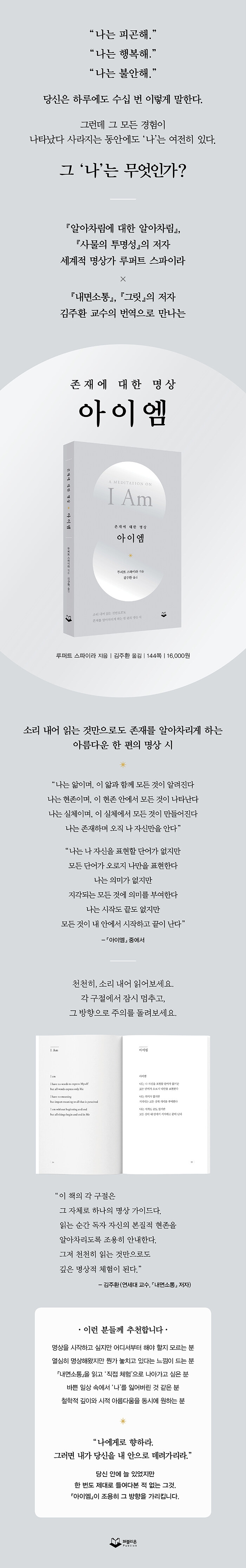 ¡º¾ÆÀÌ¿¥¡»Àº °æÇè ÀÌÀüÀÇ ¼ø¼öÇÑ ÇöÁ¸, Áï ¡®I Am¡¯À» ޱ¸ÇÏ´Â ¸í»ó¼ÀÌ´Ù. °æÇè ÀÌÀüÀÇ ³ª¸¦ ¸¸³ª°Ô ÇÏ´Â ÀÌ Ã¥Àº ¿ì¸®¸¦ °¡Àå ´Ü¼øÇÏ°íµµ ±Ù¿øÀûÀÎ ÀÚ¸®, Á¸Àç ±× ÀÚü·Î µ¹¾Æ°¡°Ô ÇÑ´Ù.