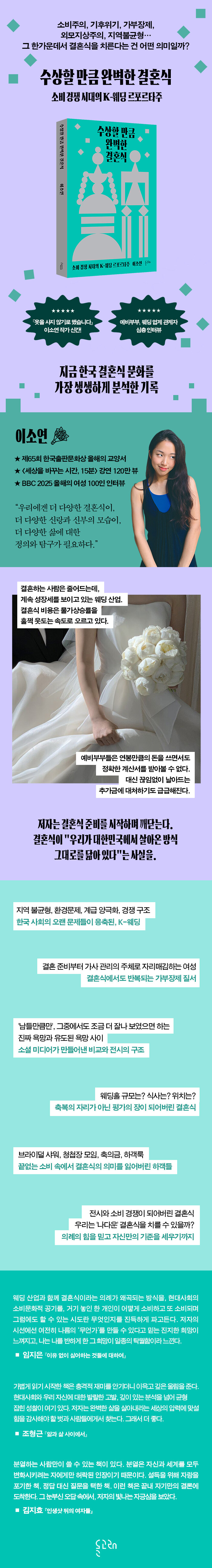 ¡º¼ö»óÇÒ ¸¸Å ¿Ïº®ÇÑ °áÈ¥½Ä¡»Àº °áÈ¥½ÄÀ» ÁغñÇÑ °æÇèÀÌ ÀÖ´Â À̵é°ú ¿þµù ¾÷°è °ü°èÀÚ ¼ö½Ê ¸íÀ» ¸¸³ª ÀÎÅͺäÇϰí, ÀúÀÚ º»ÀÎÀÌ Á÷Á¢ °æÇèÇϰí ÃëÀçÇÑ ³»¿ëÀ» ¹ÙÅÁÀ¸·Î ÇöÀç Çѱ¹ÀÇ °áÈ¥½Ä ¹®È¸¦ ºÐ¼®ÇÑ ¸£Æ÷¸£Å¸ÁÖ´Ù. ÀúÀÚ´Â °áÈ¥½Ä Áغñ¸¦ ½ÃÀÛÇÏ´Â ¼ø°£ ±ú´Ý´Â´Ù. °áÈ¥½ÄÀÌ ¡°¿ì¸®°¡ ´ëÇѹα¹¿¡¼ »ì¾Æ¿Â ¹æ½Ä ±×´ë·Î¸¦ ´à¾Æ ÀÖ´Ù¡±´Â »ç½ÇÀ». ÀÚº»ÁÖÀÇ ½ÃÀå ³í¸®°¡ ÁÖµµ±ÇÀ» Àâ°í, °³ÀÎÀº ÆÄÆíÈµÇ¾î ¼ÒºñÀڷμ Àǹ«°¡ ºÎ¿©µÈ´Ù. °áÈ¥½Äµµ ÀÌ·¯ÇÑ ³í¸®¿¡¼ ÀÚÀ¯·Î¿ï ¼ö ¾ø´Ù. °áÈ¥½Ä¿¡ À̸£±â±îÁö ¼ö¸¹Àº ´Ü°è¸¦ °ÅÃÄ¾ß Çϰí, °¢ ´Ü°è¿¡´Â ³¡¾ø´Â ¼±ÅÃÁö°¡ ÆîÃÄÁø´Ù. ¡°Àλý¿¡ ÇÑ ¹ø»Ó¡±À̶ó´Â Ưº°ÇÑ ÇϷ縦 ¿Ïº®ÇÏ°Ô ¸¸µé±â À§ÇØ °áÈ¥½Ä Áغñ´Â 1³â ÀÌ»ó ¼Ò¿äµÇ´Â Àå±â ÇÁ·ÎÁ§Æ®°¡ µÇ¾î ¸¶Ä¡ Á¤ÇØÁø ±æÀÌ ÀÖ´Â µí ¿¹ºñºÎºÎ¸¦ ¸ô¾Æ°£´Ù.