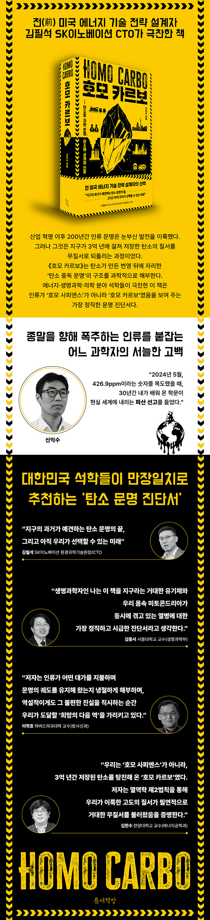 Àηù´Â ½º½º·Î¸¦ ¡®È£¸ð »çÇÇ¿£½º¡¯, Áï ÁöÇý·Î¿î Á¸Àç¶ó Á¤ÀÇÇØ ¿Ô´Ù. ±×·¯³ª ¿ì¸®°¡ ´©¸®´Â Âù¶õÇÑ ¹ø¿µÀÇ ½Çü¸¦ µé¿©´Ùº¸¸é ±× ±â¹Ý¿¡´Â ¾ðÁ¦³ª ÇϳªÀÇ ¿¡³ÊÁö¿øÀÌ Á¸ÀçÇÑ´Ù. ¹Ù·Î ź¼Ò´Ù. ½º¸¶Æ®Æù, ÀÚµ¿Â÷, Ç×°ø±â, µµ½ÃÀÇ ºÒ²É°ú µû¶æÇÑ ¾È½Äó±îÁö. Çö´ë ¹®¸íÀÇ °ÅÀÇ ¸ðµç ±âÀûÀº Áö±¸°¡ 3¾ï ³â µ¿¾È ÁöÁú ¼Ó¿¡ Áú¼ ÀÖ°Ô ÀúÀåÇØ µÐ ź¼Ò ¿¡³ÊÁö¸¦ ²¨³» ¾²¸é¼ °¡´ÉÇØÁ³´Ù. ÀúÀÚ ½ÅÀͼö ±³¼ö´Â ÀÌ ÁöÁ¡¿¡¼ Àηù¸¦ »õ·Ó°Ô Á¤ÀÇÇÑ´Ù. ¡®È£¸ð Ä«¸£º¸(Homo Carbo)¡¯. ź¼Ò ¾øÀÌ´Â ´Ü ÇÑ ¼ø°£µµ À¯ÁöµÉ ¼ö ¾ø´Â, ź¼Ò¿¡ Áßµ¶µÈ ¹®¸íÀÇ Àΰ£ÀÌ´Ù.