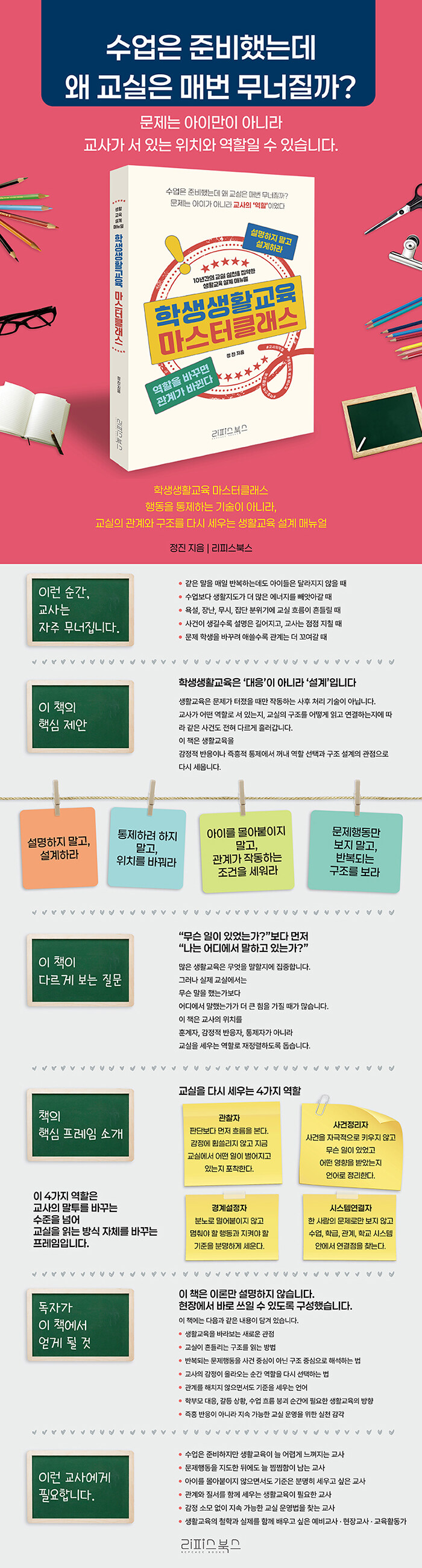 ¸®ÇǽººÏ½º°¡ ¡¶Çлý»ýȰ±³À° ¸¶½ºÅÍŬ·¡½º¡·¸¦ Ãâ°£Çß´Ù. ÀÌ Ã¥Àº »ýȰ±³À°À» ´ÜÁö ¹®Á¦ÇൿÀ» ¸ØÃß°Ô ÇÏ´Â ±â¼úÀ̳ª ÁïÈïÀû ´ëÀÀÀÇ ¿µ¿ªÀ¸·Î º¸Áö ¾Ê´Â´Ù. ¿ÀÈ÷·Á ±³½Ç¿¡¼ ¹Ýº¹µÇ´Â °¥µî, Èçµé¸®´Â ¼ö¾÷, °¨Á¤ÀÌ Ä¡¼Ú´Â Àå¸éµéÀ» ±³»çÀÇ ¿ªÇÒ°ú ±¸Á¶ÀÇ ¹®Á¦·Î ´Ù½Ã Àо¸ç, ±³»ç°¡ ÀÚ½ÅÀÇ ÀÚ¸®¸¦ »õ·Ó°Ô ¼±ÅÃÇϵµ·Ï µ½´Â ½ÇõÀû ¾È³»¼´Ù.