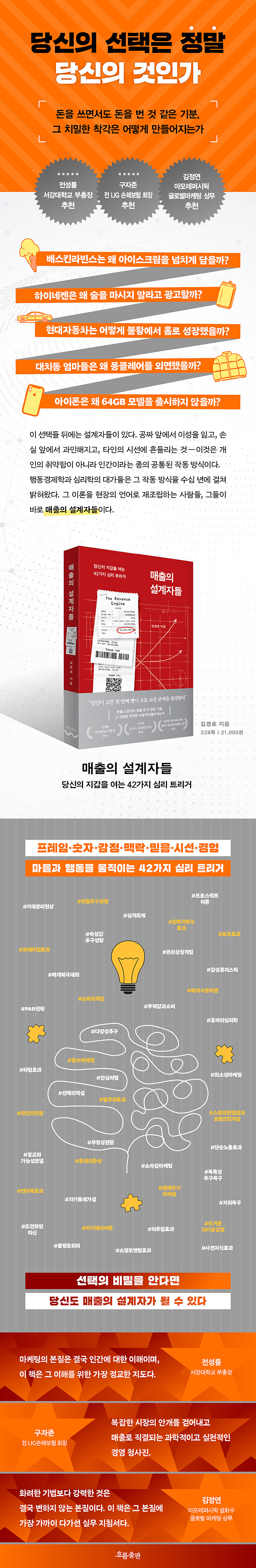 ÀúÀÚ ±è°æÈ£ ±³¼ö´Â ÇÑȱ׷졤¸ÅÀÏÀ¯¾÷¡¤ÇÏÀÌÆ®Áø·Î¡¤¾Æ½Ã¾Æ³ªÇ×°ø µî ¼ö½Ê °³ ±â¾÷ÀÇ ºê·£µå Àü·« ÄÁ¼³ÆÃÀ» ¼öÇàÇϸç, 40³â ÀüÀÇ ½É¸®ÇÐ ³í¹®ÀÌ ¿À´Ã³¯ ȸÀǽÇÀÇ ³Á¦¸¦ ÇØ°áÇÏ´Â Àå¸éµéÀ» ¹Ýº¹ÀûÀ¸·Î ¸ñ°ÝÇØ¿Â ¿¬±¸ÀÚÀÌÀÚ Àü·«°¡´Ù. ±×´Â Ä«³Ê¸Õ¡¤Å»·¯ µî ´ë°¡µéÀÌ °ËÁõÇÑ Çൿ°æÁ¦ÇÐ, ½É¸®ÇÐ, ¸¶ÄÉÆÃ ÀÌ·ÐÀ» ÇÏÀ̳×ÄËÀÇ ±¤°í¿Í ¹è½ºÅ²¶óºó½ºÀÇ ¾ÆÀ̽ºÅ©¸² ÇÑ ½ºÄò ¾È¿¡¼ »ì¾Æ ¿òÁ÷ÀÌ´Â 7°¡Áö ÄÚµå¿Í 42°¡Áö Æ®¸®°Å·Î Áý´ë¼ºÇß´Ù.