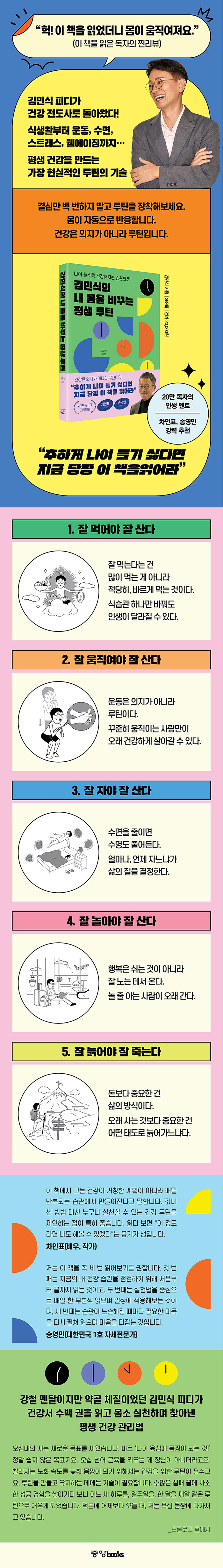 Ã¥¿¡¼´Â ³ª»Û ½À°üÀ» ¾ïÁö·Î ²÷¾î³»´Â µ¥ ¸Å´Þ¸®±âº¸´Ù, ÁÁÀº ½À°üµéÀ» ÀǽÄÀûÀ¸·Î ¿«¾î °Ç°ÇÑ ·çƾÀ» ¸¸µå´Â ÀÏÀ̾߸»·Î »îÀ» ¹Ù²Ù´Â ÁøÂ¥ ¹æ¹ýÀÓÀ» º¸¿©ÁØ´Ù. ÀÌ·¯ÇÑ °üÁ¡¿¡¼, ¸Ô°í, ¿òÁ÷À̰í, ÀÚ°í, ³î°í, ³ªÀÌ µé¾î°¡´Â Àü °úÁ¤À» ÇϳªÀÇ ·çƾÀ¸·Î ¼³°èÇÏ´Â ¹ýÀ» Â÷±ÙÂ÷±Ù Ç®¾î³½´Ù. 1ºÎ ¡®Àß ¸Ô¾î¾ß Àß »ê´Ù¡¯¿¡¼´Â ´õÇϱ⺸´Ù »©±â°¡ ¸ÕÀú¶ó´Â °üÁ¡¿¡¼ ½Ä½À°üÀ» Á¡°ËÇϰí, ´Ü¸À Áßµ¶, ¾×»ó°ú´ç, °øº¹ÀÇ ½Ã°£, ¹Ý·Á±Õ, ¾ÆÄ§ ¹ä»ó°ú Ç÷´ç ¹®Á¦¸¦ ÅëÇØ ¸öÀÇ ¹ÙÅÁÀ» ´Ù½Ã ¼¼¿ì´Â ¹æ¹ýÀ» ¤¾îÁØ´Ù. 2ºÎ ¡®Àß ¿òÁ÷¿©¾ß Àß »ê´Ù¡¯¿¡¼´Â ÅëÁõÀ» °æ°í ½ÅÈ£·Î Àаí, °È±â¿Í ´Þ¸®±â, üÁß °¨·®, ±ÙÅ×Å©, Ǫ½Ã¾÷°ú ½ºÄõÆ®±îÁö À̾îÁö´Â ·çƾÀ¸·Î ±âÃÊ Ã¼·ÂÀ» Ű¿ì´Â ¹æ¹ýÀ» ¾È³»ÇÑ´Ù. 3ºÎ ¡®Àß ÀÚ¾ß Àß »ê´Ù¡¯´Â ¼÷¸é°ú »ýü½Ã°è ȸº¹ÀÇ Á߿伺À» ´Ù·ç°í, 4ºÎ ¡®Àß ³î¾Æ¾ß Àß »ê´Ù¡¯´Â Àß ³î°í °è¼Ó ¹è¿ì¸ç »îÀÇ ÀÇ¿åÀ» À¯ÁöÇÏ´Â ¹æ½ÄÀ» ¤¾îÁØ´Ù. 5ºÎ ¡®Àß ´Ä¾î¾ß Àß Á״´١¯´Â ¸àÅ» °ü¸®¿Í ³ëÈÄ Áغñ, ¸¶Áö¸·±îÁö Àΰ£´ä°Ô »ì¾Æ°¡´Â ŵµ¸¦ ´Ù·é´Ù.