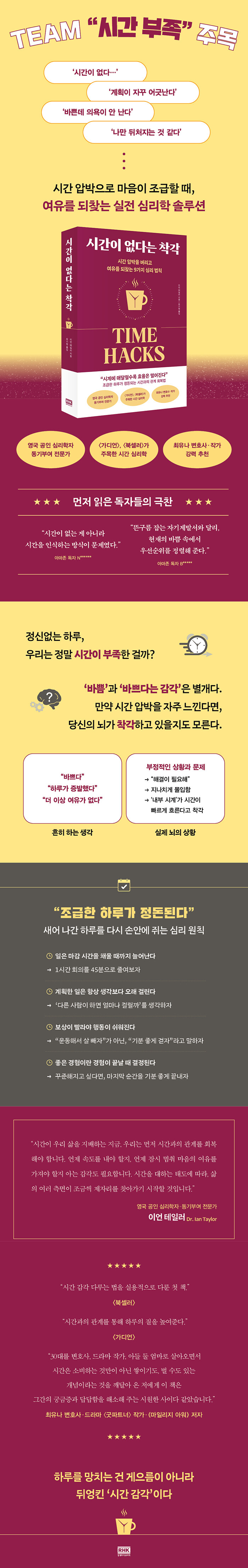 ½Ã°£ÀÌ ºÎÁ·ÇÏ´Ù´Â Á¶±ÞÇÔ, ±× Á¶±ÞÇÔÀÌ ¸¸µå´Â ¾Ð¹Ú°¨, ¾Ð¹Ú°¨ÀÌ ºÒ·¯¿À´Â ¹Ýº¹ÀûÀÎ ½Ç¼ö¿Í °íÅë. ÀÌ ¾Ç¼øÈ¯À» ²÷À¸·Á¸é ½Ã°£°ú ¸Î´Â °ü°èºÎÅÍ ´Ù½Ã ¼³Á¤ÇÒ Çʿ䰡 ÀÖ´Ù. ¡º½Ã°£ÀÌ ¾ø´Ù´Â Âø°¢¡»Àº ¿ì¸®°¡ ÈçÈ÷ °Þ´Â ½Ã°£¿¡ °üÇÑ ½É¸®Àû Âø°¢À» ¤¾î ÁÖ´Â µ¿½Ã¿¡, ±×°ÍÀ» ´Ù·ç´Â ½Ç¿ëÀûÀÎ ÇØ¹ý±îÁö Á¦½ÃÇÑ´Ù.