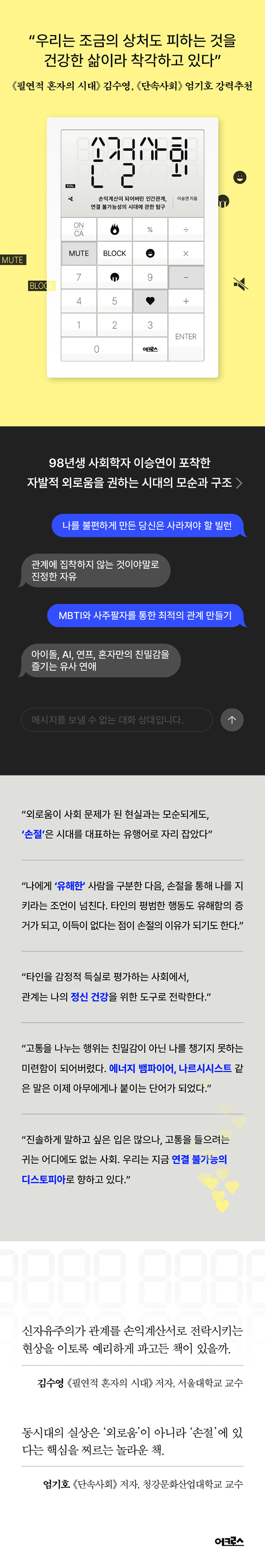 »çȸ ±¸¼º¿ø ´ë´Ù¼ö°¡ ¿Ü·Î¿òÀ» È£¼ÒÇÏ´Â µ¿½Ã¿¡ ÀÚ¹ßÀûÀ¸·Î ´ÜÀýÀ» ¼±ÅÃÇÏ´Â ÀÌÀ¯´Â ¹«¾ùÀϱî? ¡¶¼ÕÀý»çȸ¡·´Â ŸÀÎÀ» °¨Á¤Àû µæ½Ç¿¡ µû¶ó Æò°¡Çϸç, ¼ÕÀýÀ̶ó´Â ÇàÀ§¸¦ ÅëÇØ °ü°è¸¦ ÃÖÀûÈÇÏ´Â °ÍÀÌ ¿ì¸®ÀÇ »õ·Î¿î ¹®ÈÀû °úÁ¦°¡ µÇ¾ú´Ù°í À̾߱âÇϴ åÀÌ´Ù. ¼ÕÀͰè»êÀÌ µÇ¾î¹ö¸° ¿À´Ã³¯ÀÇ Àΰ£°ü°è, ±× ¾È¿¡ ´ã±ä °¢ÀÚµµ»ýÀÇ ³í¸®¸¦ ½É¸®Çп¡¼ ´ëÁß¹®È¿¡ À̸£´Â Àü¹æÀ§Àû ޱ¸¸¦ ÅëÇØ ¼³¸íÇÑ´Ù.