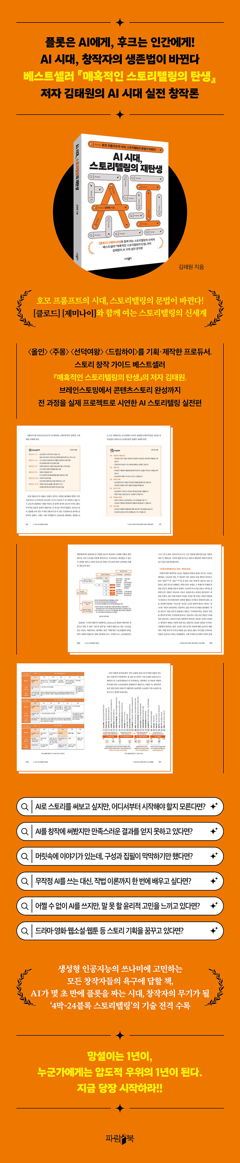 ÀÌ Ã¥ÀÇ °¡Àå Å« È¿¿ëÀº µ¶ÀÚ°¡ ±¸»ó¸¸ Çϰí ÀÖ´ø ÇÁ·ÎÁ§Æ®¸¦, ½ÉÁö¾î ±¸»ó¸¸ Á¸ÀçÇÏ´õ¶óµµ, ¿Ï¼ºµÈ ÀÛǰÀ¸·Î À̲ø¾î³¾ ¼ö ÀÖµµ·Ï ½ÇÀüÀûÀÎ °¡À̵尡 µÇ¾îÁشٴ °ÍÀÌ´Ù. ÀúÀÚ´Â ½ºÅ丮âÀÛ ÀÛ¹ý¼·Î º£½ºÆ®¼¿·¯ ¹Ý¿¿¡ ¿À¸¥ ÀüÀÛ ¡º¸ÅȤÀûÀÎ ½ºÅ丮ÅÚ¸µÀÇ Åº»ý¡»¿¡¼ ƯÈ÷ ±¸¼ºÀ̶ó´Â âÀÛ È°µ¿¿¡ ÁÖ¸ñÇϸç, ½ºÅ丮âÀÛ ÀÔ¹®ÀÚ ¶Ç´Â ½ºÅ丮 ±¸¼ºÀ» ¿©ÀüÈ÷ ¾î·Á¿öÇÏ´Â ±â¼º âÀÛÀÚµéÀ» À§ÇØ »ó¼¼ÇÑ °¡À̵带 ¸¶·ÃÇÑ ¹Ù ÀÖ´Ù. ¡®4¸·-24ºí·Ï¡¯À¸·Î ±¸Ã¼ÈµÇ´Â ÀÌ ±¸Á¶È ±â¹ý¿¡¼, AI¸¦ Ȱ¿ëÇÒ °æ¿ì ¸Å¿ì ½Å¼ÓÇϸ鼵µ ³ôÀº Ä÷¸®Æ¼·Î °á°ú¹°ÀÌ µµÃâµÊÀ» ÀúÀÚ´Â Á÷Á¢ ½Ã¿¬ÇØ º¸ÀδÙ. ½ÇÁ¦·Î âÀÛÀÚÀÇ °¡Àå Å« ³°üÀ̾ú´ø, ´ë°³ÀÇ °æ¿ì¿¡´Â ¼»çÀÇ º»ÁúÀ̶ó°í±îÁö ºÒ·È´ø ±¸¼ºÀÇ ¿µ¿ªÀ» AI°¡ ¸»²ûÇÏ°Ô Ã³¸®ÇÏ´Â ±¤°æÀÌ´Ù. ±×¸®°í ºê·¹ÀνºÅä¹Ö¡¤ÄܼÁÆ® °³¹ß, ¿øÃµ½ºÅ丮 °³¹ß, ÄÜÅÙÃ÷½ºÅ丮 °³¹ßÀÇ ¸Å ´Ü°è¸¶´Ù AI¸¦ Ȱ¿ëÇÑ ½ÇÁ¦¸¦ ±×´ë·Î Á¦½ÃÇÏ¸ç °·ÂÇÑ AIÀÇ ÀÌ¿ë ¹æ¹ýÀ» Á¦°øÇÑ´Ù.