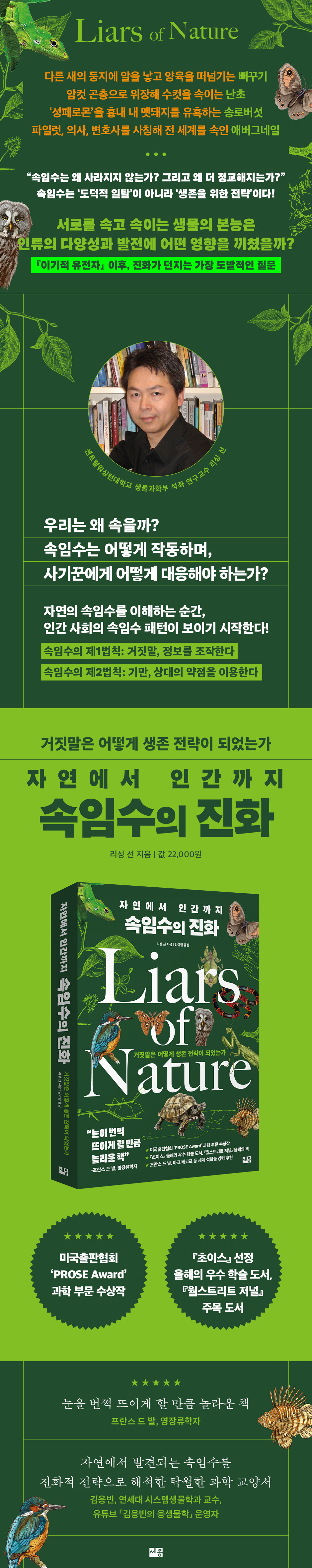¡ºÀÚ¿¬¿¡¼ Àΰ£±îÁö ¼ÓÀÓ¼öÀÇ ÁøÈ¡»´Â ¼ÓÀÓ¼öÀÇ Á¦1¹ýÄ¢ ¡®°ÅÁþ¸»¡¯°ú Á¦2¹ýÄ¢ ¡®±â¸¸¡¯À» ÅëÇØ, »ý¸íü°¡ ¾î¶»°Ô »ó´ëÀÇ °¨°¢°ú ÀÎÁöÀÇ ºóÆ´À» ÆÄ°íµé¸ç ÁøÈÇØ¿Ô´ÂÁö, ±× °úÁ¤¿¡¼ °¨½Ã, ÆÇº°, ½Å·ÚÀÇ Ã¼°è°¡ ¾î¶»°Ô ÇÔ²² ¹ß´ÞÇØ¿Ô´ÂÁö¸¦ º¸¿©ÁØ´Ù. ¼¾Æ®·²¿ö½ÌÅÏ´ëÇб³ »ý¹°°úÇкΠ¼®Á ¿¬±¸±³¼öÀÎ ¸®½Ì ¼±Àº »ý¹°ÇÐ, ÀÎÁö°úÇÐ, ÁøÈ½É¸®ÇÐÀ» ³Ñ³ªµé¸ç ÀÚ¿¬°ú Àΰ£ »çȸ¸¦ °üÅëÇÏ´Â ¼ÓÀÓ¼öÀÇ ¿ø¸®¸¦ ޱ¸ÇÑ´Ù. ±×´Â Á¤Á÷À» ¼ÓÀÓ¼ö°¡ »ç¶óÁø µÚ »ý°Ü³ ¹Ì´öÀÌ ¾Æ´Ï¶ó, ¼ÓÀÓ¼ö¿ÍÀÇ °æÀï ¼Ó¿¡¼ ¼±ÅÃµÈ Àü·«À̶ó°í ¸»ÇÑ´Ù.