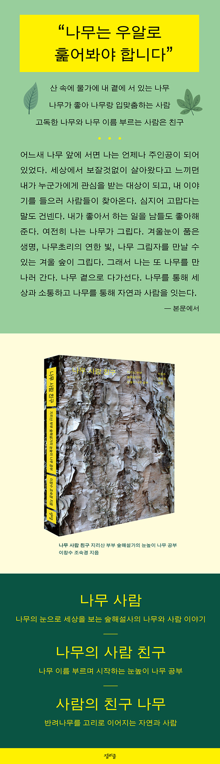 Á¦ÁÖµµ ³»Ã¢(³Á°¡)À» ´©ºñ¸ç ³ª¹«¿Í ½£À» º¸°í ÀÚ¶õ ÀÌâ¼ö´Â µµ½Ã°¡½º ȸ»ç¿¡¼ ÀÏÇÏ°Ô µÈ´Ù. ü³³ ¿ä±Ý ³³ºÎ¸¦ µ¶ÃËÇÏ´À¶ó »ýȰ°í °Þ´Â »ç¶÷µéÀ» ¸¸³ª¾ß¸¸ ÇÏ´Â µµ½Ã »ýȰÀÌ Èû°ã´Ù. ±ÍÃÌÀ» ¶°¿Ã¸®Áö¸¸ ¸·¸·ÇÑ »ý°è°¡ °É¸²µ¹ÀÌ´Ù. ´ÙÇàÈ÷ ±¹¸³°ø¿ø°ø´Ü Á¾º¹¿ø±â¼ú¿ø¿¡¼ ÀÏÀÚ¸®¸¦ ±¸Çϰí, ½£Çؼ³°¡±¤ÁÖÀü³²Çùȸ »ç¹«±¹ÀåÀÌ ÃßÃµÇØ ½£Çؼ³µµ ½ÃÀÛÇÑ´Ù. ³ª¸¸ÀÇ ¡®¹Ý·Á³ª¹«¡¯¸¦ Á¤Çϰí, ³ª¹« À̸§À» ºÎ¸£¸ç ¡®´«³ôÀÌ ³ª¹« °øºÎ¡¯¸¦ ½ÃÀÛÇÑ´Ù. ³ª¹«ÀÇ ´«À¸·Î ¼¼»óÀ» ¹Ù¶óº¸ÀÚ »ç¶÷ÀÇ »îÀÌ ¹Ù²ï´Ù. Çѱ¹¹æ¼Û(KBS) ¡´¿µ»ó¾Ù¹ü »ê¡µ¿¡ Ãâ¿¬ÇØ ³ª¹« À̾߱⸦ µé·ÁÁֱ⵵ ÇÑ´Ù. ÀÌÁ¦ º¸À߰;ø´Ù°í ¿©±â´ø ³»°¡ ÁÖÀΰøÀÌ µÇ´Â °æÇè°ú ´«³ôÀÌ ³ª¹« °øºÎ À̾߱⸦ ´õ ¸¹Àº »ç¶÷¿¡°Ô ³ª´©°í ½Í¾î ³ª¹«·Î ¸¸µç Ã¥ ¡¶³ª¹« »ç¶÷ Ä£±¸¡·¸¦ ³½´Ù. Áö¸®»ê ºÎºÎ ½£Çؼ³°¡ ºÎºÎ´Â ¿À´Ãµµ ³ª¹« À̸§À» ºÎ¸£¸ç ³ª¹«¿¡°Ô ´Ù°¡¼°í ÀÖ´Ù.