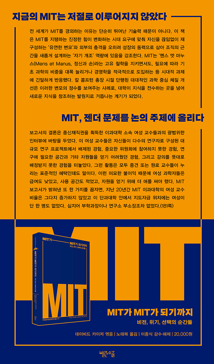 Àü ¼¼°è°¡ MIT¸¦ °æ¿ÜÇÏ´Â ÀÌÀ¯´Â ´Ü¼øÈ÷ ¶Ù¾î³ ±â¼ú·Â ¶§¹®ÀÌ ¾Æ´Ï´Ù. ÀÌ Ã¥Àº MIT¸¦ ÁöÅÊÇÏ´Â ÁøÁ¤ÇÑ ÈûÀÌ º¯ÈÇÏ´Â ½Ã´ë ¿ä±¸¿¡ ¸ÂÃç ÀÚ½ÅÀ» ²÷ÀÓ¾øÀÌ À籸¼ºÇÏ´Â ¡®À¯¿¬ÇÑ º¯¸ð¡¯¿Í ¿ÜºÎÀÇ Ãæ°ÝÀ» ¿ÀÈ÷·Á ¼ºÀåÀÇ µ¿·ÂÀ¸·Î »ï¾Æ Á¶Á÷ÀÇ ±Ù°£À» »õ·Ó°Ô ¼³°èÇÏ´Â ¡®Àڱ⠰³Á¶¡¯ ¿ª·®¿¡ ÀÖÀ½À» °Á¶ÇÑ´Ù. MIT´Â ¡®¸à½º ¿§ ¸¶´©½º(Mens et Manus, Á¤½Å°ú ¼Õ)À̶ó´Â °íÀ¯ öÇÐÀ» ÁöŰ¸é¼µµ, Çʿ信 µû¶ó ±âÃÊ °úÇÐÀÇ ºñÁßÀ» ´ëÆø ´Ã¸®°Å³ª °æ¿µÇÐÀ» Àû±ØÀûÀ¸·Î µµÀÔÇÏ´Â µî ½Ã´ëÀû °úÁ¦¿¡ ±ä¹ÐÇÏ°Ô ¹ÝÀÀÇß´Ù. Ä® ÄÞÇÁÅÏ ÃÑÀå ½ÃÀý ´ÜÇàµÈ ´ë´ëÀûÀÎ °úÇÐ Áß½É Ã¼Áú °³¼±Àº ÀÌ·¯ÇÑ º¯¸ðÀÇ Á¤¼ö¸¦ º¸¿©ÁÖ´Â »ç·Ê·Î, ´ëÇÐÀÌ Áö½ÄÀ» Àü¼öÇÏ´Â °÷À» ³Ñ¾î »õ·Î¿î Áö½ÄÀ» âÁ¶ÇÏ´Â ¹ß¿øÁö·Î °Åµì³ª´Â °è±â°¡ µÇ¾ú´Ù.