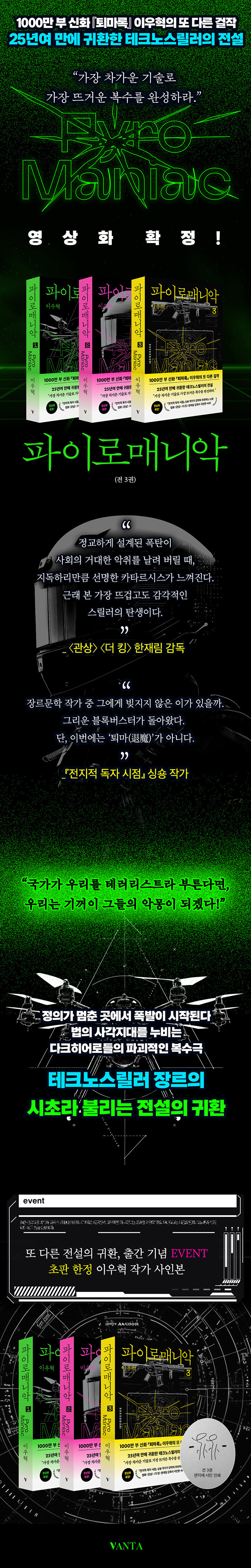 ¡ºÅ𸶷ϡ» ´©Àû ÆÇ¸Å 1,000¸¸ ºÎ¶ó´Â ¾ÐµµÀûÀÎ ±â·ÏÀ» º¸À¯ÇÑ ÀÌ¿ìÇõ ÀÛ°¡. ±×°¡ 25³â¿© ¸¸¿¡ Àü¸é °³Á¤ÇÏ¿© ¿Ï¼ºÇÑ Å×Å©³ë½º¸±·¯ À帣ÀÇ ½ÃÃÊÀÌÀÚ Àü¼³ ¡ºÆÄÀ̷θŴϾǡ»(Àü 3±Ç)ÀÌ Ãâ°£µÆ´Ù. ¡ºÆÄÀ̷θŴϾǡ»Àº ¹ýÀÇ »ç°¢Áö´ë¿¡ ¼ûÀº ¾ÇäÂÀ» È­¾à°ú ÷´Ü ±â¼ú·Î Á÷Á¢ ó´ÜÇÏ´Â ¼¼ ¸íÀÇ ´ÙÅ©È÷¾î·Î, ÀÏ¸í ¡®ÇÇ¿¥(PM)¡¯ÀÇ Æø¹ßÀûÀÎ º¹¼ö±ØÀÌ´Ù. 1999³â ¹Ì¿Ï°áÀÇ »óÅ·Π¿¬Àç°¡ Áß´ÜµÇ¾î ¹«¼öÇÑ ÆÒµéÀÌ ¿À·§µ¿¾È ¿Ï°áÀ» ±â´Ù·Á¿Â ÀÛǰÀ̱⵵ ÇÏ´Ù. ÃÖÃÊ Ãâ°£ ÈÄ 25³âÀÌ ³Ñ´Â ½Ã°£ÀÌ Áö³­ ¸¸Å­, ±â¼úÀÇ ºñ¾àÀû ¹ßÀü°ú ½Ã´ëÀÇ º¯È­¸¦ °í·ÁÇÏ¿© ÀÌ¿ìÇõ ÀÛ°¡´Â ´ë´ëÀûÀÎ °³Á¤ ÀÛ¾÷À» °¨ÇàÇß´Ù. °ø°ú´ëÇÐÀ» Á¹¾÷ÇÏ°í ¹æÀ§»ê¾÷ü¿¡¼­ ±Ù¹«ÇÑ ¹Ù ÀÖ´Â ÀÛ°¡ÀÇ Àü¹® Áö½ÄÀ¸·Î ±¸ÇöµÈ ±Ù¹Ì·¡ ´ëÇѹα¹ ½Å¹«±âµéÀÇ »ý»ýÇÑ Áú°¨, ±×¸®°í ½° ¾øÀÌ ¸ô¾ÆÄ¡´Â ½ºÇǵðÇÑ ¾×¼Ç Ç÷ÔÀÌ Å×Å©³ë½º¸±·¯·Î¼­ÀÇ À帣Àû Äè°¨À» ¼±»çÇÑ´Ù.