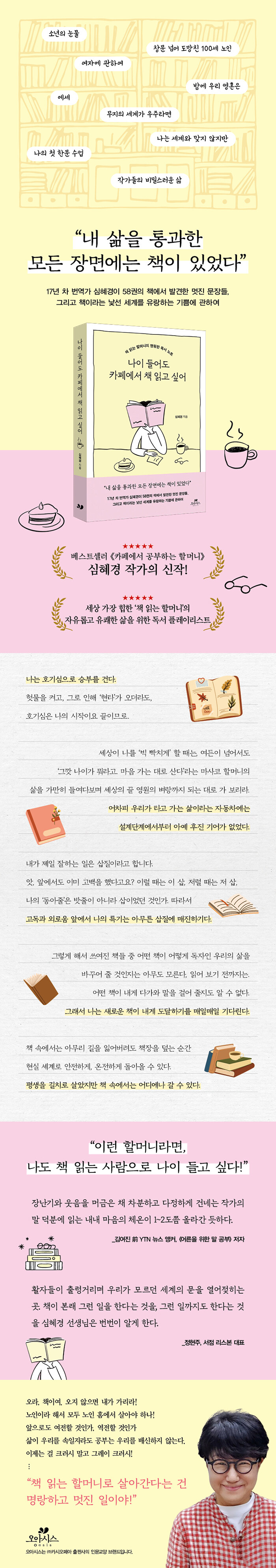 ½ÉÇý°æ ÀÛ°¡´Â 27³â°£ µµ¼°ü »ç¼·Î ÀÏÇÏ´Ù ¿ø¼ Àд Àç¹Ì¿¡ Ç« ºüÁ® ¹ø¿ª°¡°¡ µÇ¾ú´Ù. ÀÌÁ¦ °ð ÀÏÈçÀ» ¸ÂÀÌÇÏ´Â °Ô ¹Ï±âÁö ¾ÊÀ» Á¤µµ·Î, ³ªÀ̸¦ ¶Ù¾î³Ñ´Â ¹è¿ò¿¡ ´ëÇÑ ¿Á¤°ú ÀúÀÚ Æ¯À¯ÀÇ ¸í¶ûÇÔ ´öºÐ¿¡ ÀüÀÛ ¡¶Ä«Æä¿¡¼ °øºÎÇÏ´Â ÇÒ¸Ó´Ï¡·´Â ¼ø½Ä°£¿¡ º£½ºÆ®¼¿·¯°¡ µÇ¾ú´Ù. ½ÉÇý°æ ÀÛ°¡ÀÇ ÆÒµéÀº ¡®³ªµµ Àú·¸°Ô ³ªÀÌ µé°í ½Í´Ù!¡¯, ¡®´à°í ½ÍÀº ¿Õ¾ð´Ï¡¯, ¡®¿©¼º ÀÛ°¡µéÀÇ ¿ö³Êºñ¡¯¶ó°í À̾߱âÇϱ⵵ ÇÑ´Ù.