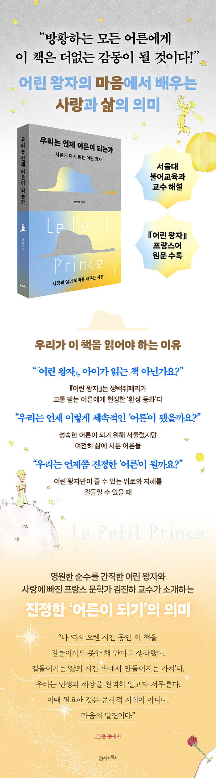 ¡°¾î¸¥ÀÌ µÇ¾î ´Ù½Ã ÀÐ°í »ý°¢º¸´Ù ³Ê¹« ¸¹Àº ´«¹°À» Èê·È´Ù.¡± ¡º¾î¸° ¿ÕÀÚ¡»¸¦ ÀÐÀº ¾î¸¥µéÀÌ Çϳª°°ÀÌ ÀÔÀ» ¸ð¾Æ À̾߱âÇÑ´Ù. ¹«½ÉÈ÷ ³Ñ°å´ø ¹®Àåµé, ÀÌÇØµÇÁö ¾Ê´ø Àå¸éµéÀÌ ¸¶À½¿¡ ¸Ó¹®´Ù´Â ÀÌÀ¯´Ù. µè´Ù º¸¸é ¹®µæ ÇÑ °¡Áö Àǹ®ÀÌ »ý±ä´Ù. ¾î¸° ¿ÕÀÚ´Â º¯ÇÔ¾øÀÌ ±× ÀÚ¸®¿¡ ÀÖ¾ú´Âµ¥ ¿Ö ¿ì¸®´Â »õ»ï½º·¹ »õ·Î¿î ±ú´ÞÀ½°ú °¨µ¿À» ¸¶ÁÖÇÏ´Â °É±î? ¡°ÀÌ Ã¥À» ¾î¸°À̸¦ À§ÇÑ µ¿È·Î¸¸ Àо ¾È µÈ´Ù. »ýÅÃÁãÆä¸®´Â À̾߱âÇÑ´Ù. ¹æÈ²ÇÏ´Â ¾î¸¥À» À§ÇÑ ¼Ò¼³À» ÇåÁ¤ÇÏ°Ú´Ù°í ¸»ÀÌ´Ù.¡± ¼¿ï´ë ±èÁøÇÏ ±³¼ö´Â ¹«½É°á¿¡ Áö³ªÄ£ ¡º¾î¸° ¿ÕÀÚ¡»ÀÇ Ã¹ ÀåÀ¸·Î ¿ì¸®¸¦ À̲ö´Ù.