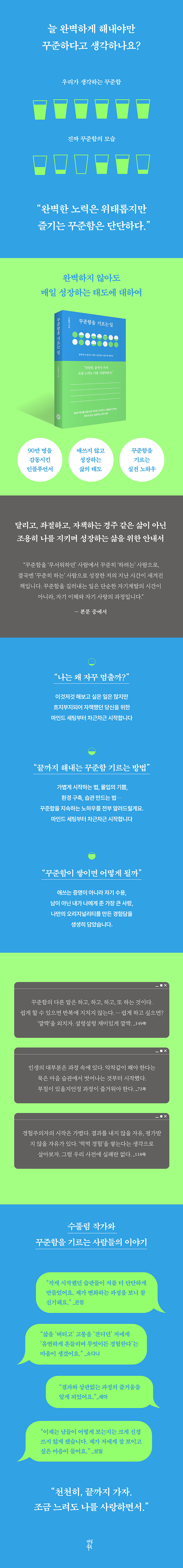 ¡º²ÙÁØÇÔÀ» ±â¸£´Â ÀÏ¡»Àº ¡®¿Ïº®¡¯ ´ë½Å ¡®Áö¼Ó¡¯À̶ó´Â ´ë¾ÈÀ» Á¦½ÃÇÑ´Ù. ½ÃÀÛÀÌ µÎ·Á¿î À̵鿡°Ô °á°úº¸´Ù °úÁ¤¿¡ ¸Ó¹«´Â ¿ë±â¸¦ ºÏµ¸¿î´Ù. Àß ÇØ³»´Â °á°úº¸´Ù ÀßÇÏ·Á´Â ¸¶À½ ÀÚü¸¦ ¼ÒÁßÈ÷ ¿©±æ ¶§, Áõ¸íÀÇ ¾Ð¹Ú¿¡¼ ¹þ¾î³ª ³ª·Î¼ Á¸ÀçÇÒ ¼ö ÀÖ´Ù. °á±¹ ²ÙÁØÇÔÀ» ±â¸£´Â °úÁ¤Àº ³ª ÀÚ½ÅÀ» »ç¶ûÇÏ´Â ¿©Á¤°ú °°´Ù. ÀڽŸ¸ÀÇ ¼Óµµ¸¦ Á¸ÁßÇϸç õõÈ÷ ³ª¾Æ°£´Ù¸é, ¿ì¸®´Â ³ª¸¦ ¼Ò¸ðÇÏÁö ¾Ê°íµµ °¡Àå ±Ù»çÇÑ »î¿¡ ´êÀ» ¼ö ÀÖÀ» °ÍÀÌ´Ù. ÀÌ Ã¥ÀÌ ±× ±æÀÇ µçµçÇÑ ¾È³»¼°¡ µÇ¾îÁÙ °ÍÀÌ´Ù.