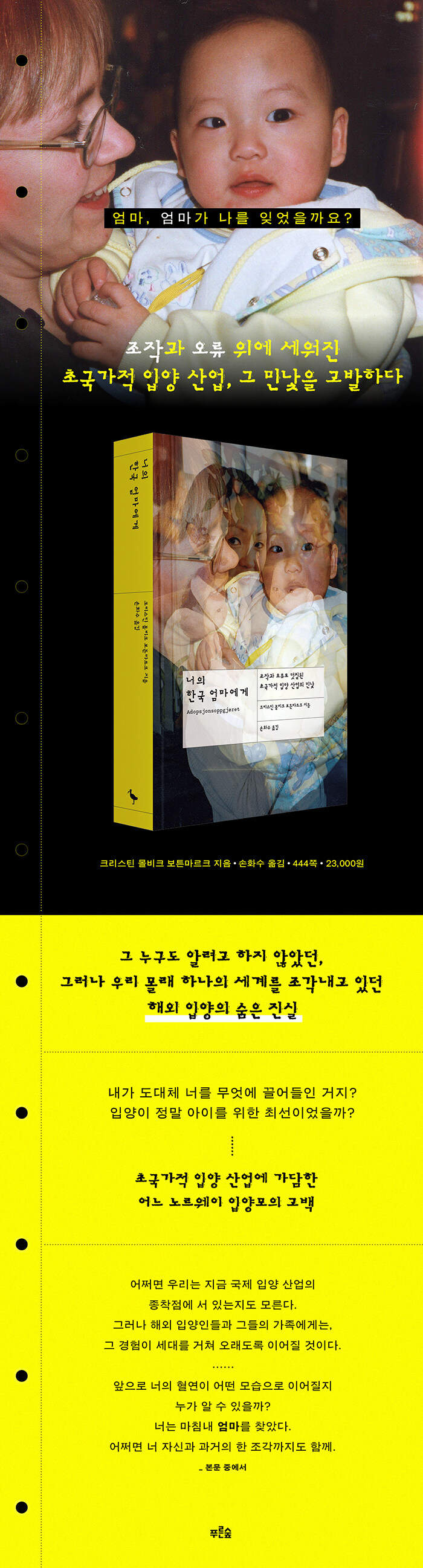 ¾ÆÀ̸¦ ÇØ¿Ü·Î ½Å¼ÓÇÏ°Ô º¸³»±â À§ÇØ 1970~1980³â´ë Çѱ¹¿¡¼ ÀÏ¾î³ ÀÏ ¿ª½Ã °¡È÷ Ãæ°ÝÀûÀ̾ú´Ù. ÀÔ¾ç ±â°üÀÇ ºü¸¥ ÀÏ󸮸¦ À§ÇØ È£ÀûÀº ¼Õ½±°Ô Á¶À۵Ǿú°í, ºÎ¸ð°¡ ÀÖ´Â ¾ÆÀ̰¡ °í¾Æ°¡ µÇ´Â °æ¿ìµµ ºÎÁö±â¼ö¿´´Ù. ½ÉÁö¾î ÀÔ¾çÀÌ ¿¹Á¤µÇ¾î ÀÖ´ø ¾ÆÀ̰¡ Á×À¸¸é ´Ù¸¥ ¾ÆÀ̰¡ Á×Àº ¾ÆÀÌÀÇ ½Å¿øÀ» ¡®¹°·Á¡¯¹Þ±âµµ Çß´Ù. ³ªÀÌ¿Í À̸§ÀÌ ´Þ¶óµµ ¸»ÀÌ´Ù. ±×·¸°Ô ÇØ¿Ü·Î ¿À°Ô µÈ ÀÔ¾çÀεéÀº Àú¸¶´ÙÀÇ ¡°ÇÏ¾á ½½ÇÄ¡±À» °ÞÀ¸¸é¼ ¼ºÀåÇß´Ù. ÀÚ½ÅÀº °áÄÚ À̰÷¿¡ ¼ÓÇÒ ¼ö ¾ø´Ù´Â Á¤Ã¼¼ºÀÇ È¥¶õ, °¢Á¾ Æø·Â°ú Çд뿡 ³Ê¹«³ªµµ ½±°Ô ³ëÃâµÇ´ø ¼ºÀå ȯ°æ, ¼û ½¯ Æ´ ¾øÀÌ ½ñ¾ÆÁö´ø ÀÎÁ¾ Â÷º°µé. ÀÌÁ¦ ÀúÀÚ´Â ÀÌ·¸°Ô Áú¹®ÇÑ´Ù. ¡°¿Ö ³ë¸£¿þÀÌ´Â ¾ÆÀ̵éÀ» µ¥·Á¿À´Â ´ë½Å, ±× ºÎ¸ðµéÀ» µ½Áö ¾Ê¾ÒÀ»±î?¡± ¡°ÇÑ ¿©¼ºÀÌ ÀÚ½ÅÀÇ ¾ÆÀ̸¦ ³»¾î ÁÖ°Ô ¸¸µå´Â °ÍÀº ¹«¾ùÀΰ¡?¡±
