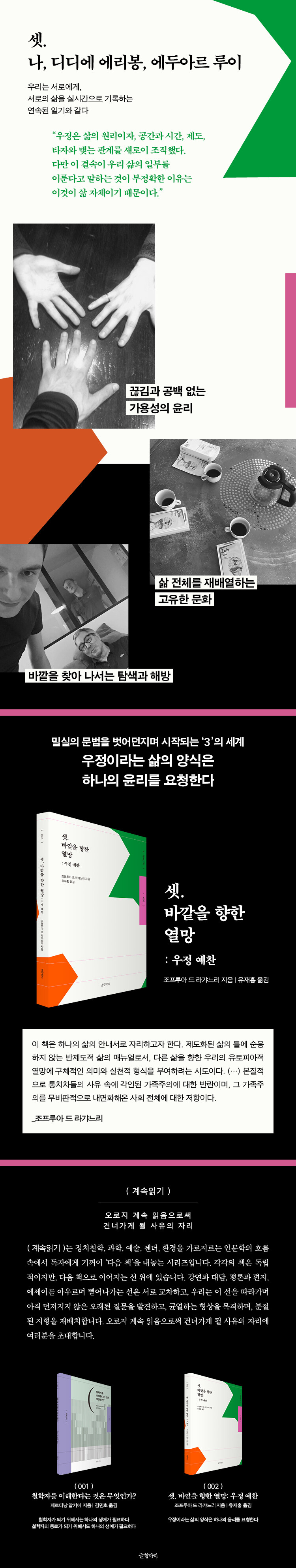 ¿ìÁ¤ÀÇ ÀÚ¸®´Â ¾îµð¿¡, ¾ðÁ¦±îÁö, ¾ó¸¶¸¸Å ÁÖ¾îÁú±î. ÀÌ Ã¥ÀÇ ÀúÀÚÀÎ Á¶ÇÁ·ç¾Æ µå ¶ó°¼´À¸®, ±×ÀÇ ¿¬ÀÎÀÌÀÚ Ä£±¸ÀÎ µðµð¿¡ ¿¡¸®ºÀ(¡º·©½º·Î µÇµ¹¾Æ°¡´Ù¡» ¡º¾î´À ¼¹Î ¿©¼ºÀÇ »î, ³ë³â, Á×À½¡» ÀúÀÚ), ¶Ç ´Ù¸¥ Ä£±¸ ¿¡µÎ¾Æ¸£ ·çÀÌ(¡º¿¡µðÀÇ ³¡¡» ÀúÀÚ). ¼¼ »ç¶÷Àº ÀÌ Áú¹®¿¡ ¾Æ¸¶ ¿µ¿øÀ» ´äÇÒ °ÍÀÌ´Ù. ¿ìÁ¤Àº ¿µ¿øÅä·Ï, ½ÉÁö¾î »îÀÇ ÀϺεµ ¾Æ´Ï¶ó »î ±× ÀÚü·Î¼ µµ·¡ÇÒ ¼ö ÀÖ´Ù. ¶ó°¼´À¸®´Â »çȸÇÐÀÚÀÌÀÚ Ã¶ÇÐÀÚ·Î »îÀÇ ¿©·¯ ÃþÀ§¸¦ Á¦¾àÇÏ´Â ±Ç·Â ü°è¸¦ ºÐ¼® ´ë»óÀ¸·Î »ï¾Æ¿Ô´Ù. ǪÄÚ, ºÎ¸£µð¿Ü, µé·ÚÁî, µ¥¸®´ÙÀÇ ±ËÀûÀ» µû¶úÀ¸¸ç, ü°è¿¡ Á¤¸éÀ¸·Î ¸Â¼°Å³ª ȤÀº ±× ¹Ù±ù¿¡¼ ºñÁ¤ÇüÀûÀÎ »îÀÇ °æ·Î¸¦ Ž»öÇß´Ù. ±×ÀÇ ÁÖµÈ Áú¹®Àº ÀÌ·¸´Ù. ¡®¿ì¸®´Â ¹«¾ùÀÌ¸ç ¹«¾ùÀÌ µÉ ¼ö Àִ°¡.¡¯ ¡®¿ì¸®°¡ µÉ ¼ö ÀÖ´ø ¼ö¸¹Àº °¡´ÉÅÂ¿Í ½ÇÁ¦·Î µÈ °Í »çÀÌÀÇ °£±ØÀº ¹«¾ùÀΰ¡.¡¯ ±×ÀÇ Àú¼ú ÀÛ¾÷Àº ÀÌ Áú¹®µé¿¡ ±¸Ã¼ÀûÀÎ »ç·Ê¸¦ µé¾î ¼¼úÇÏ´Â ¹æ½ÄÀ» ÅÃÇϴµ¥, ´Ù¸¸ ÀÌ Ã¥ÀÇ °¢º°ÇÑ Á¡À̶ó¸é ¿©±â¼ ²¨³» º¸ÀÏ À̾߱Ⱑ ±×ÀÇ Àü±â ¼Ó¿¡ ½ÇÁ¦·Î üÇèµÇ°í °¢ÀÎµÈ °ü°è¸¦ ´Ù·é´Ù´Â Á¡ÀÌ´Ù. ¼¼ »ç¶÷ÀÇ ¿ìÁ¤Àº 2011³â 9¿ùÀ» ±âÁ¡À¸·Î, °³º°Àû »î°ú »çȸÀû °ü°èÀÇ À§»óÀ» µÚÁýÀ¸¸ç ½ÃÀ۵ƴÙ. ¿ìÁ¤À̶ó´Â »îÀÇ Æ²ÀÌ Àü¸éÀûÀ¸·Î µé¾î¼± °ÍÀÌ´Ù.