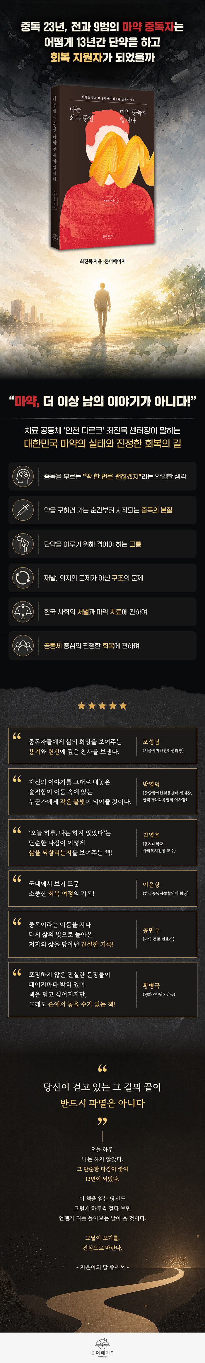 Çѱ¹ÀÌ ¾ÆÁ÷µµ ¡®¸¶¾à ûÁ¤±¹¡¯À̶ó°í ¹Ï°í ÀÖ´Â »ç¶÷µé¿¡°Ô °æÁ¾À» ¿ï¸± Ã¥ÀÌ ³ª¿Ô´Ù. ¡º³ª´Â ȸº¹ ÁßÀÎ ¸¶¾à Áßµ¶ÀÚÀÔ´Ï´Ù¡»ÀÇ ÀúÀÚ´Â ¸¶¾à¿¡ 23³âÀ̶õ ¼¼¿ùÀ» ¹ÙÃÆ´ø ¸¶¾à Áßµ¶ÀÚ´Ù. Àü°ú 9¹ü¿¡ ±³µµ¼Ò »ýȰ¸¸ 7³â¿¡ ´ÞÇÑ´Ù. ±×·¨´ø ±×°¡ Áö±ÝÀº Ä¡·á °øµ¿Ã¼ ¡®ÀÎõ ´Ù¸£Å©¡¯ ¼¾ÅÍÀåÀ¸·Î¼ ¸¶¾à Áßµ¶ÀÚµéÀÇ È¸º¹À» µ½´Â ÇöÀå¿¡¼ Ȱ¾àÇϰí ÀÖ´Ù.